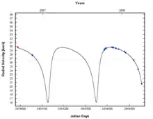 Radial velocity observations of HD 41742 A with the HARPS spectrograph detected variations on a level of several km/s over a period of months, indicating that the star is a single-lined spectroscopic binary (SB1).[16] Though an orbital fit was not attempted, A good orbital fit is possible (left), which implies that HD 41742 Ab has a minimum mass of ~0.2 M, and is on a high eccentricity ~222-day orbit around the 1.2 M primary. Given that the lines of the secondary are not detected, it must have a significantly lower luminosity than the primary, indicating that it is of late spectral type.