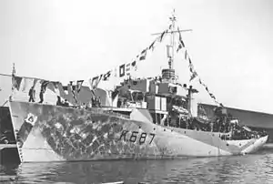 Flower-class corvettes like Guelph serving with the Royal Canadian Navy during the Second World War were different from earlier and more traditional sail-driven corvettes.[2][3][4] The "corvette" designation was created by the French as a class of small warships; the Royal Navy borrowed the term for a period but discontinued its use in 1877.[5] During the hurried preparations for war in the late 1930s, Winston Churchill reactivated the corvette class, needing a name for smaller ships used in an escort capacity, in this case based on a whaling ship design.[6] The generic name "flower" was used to designate the class of these ships, which – in the Royal Navy – were named after flowering plants.[7]
