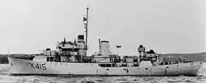 Flower-class corvettes like Hawkesbury serving with the Royal Canadian Navy during the Second World War were different from earlier and more traditional sail-driven corvettes.[2][3][4] The "corvette" designation was created by the French as a class of small warships; the Royal Navy borrowed the term for a period but discontinued its use in 1877.[5] During the hurried preparations for war in the late 1930s, Winston Churchill reactivated the corvette class, needing a name for smaller ships used in an escort capacity, in this case based on a whaling ship design.[6] The generic name "flower" was used to designate the class of these ships, which – in the Royal Navy – were named after flowering plants.[7]
