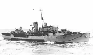 Flower-class corvettes like Vancouver serving with the Royal Canadian Navy during the Second World War were different from earlier and more traditional sail-driven corvettes.[2][3][4] The "corvette" designation was created by the French as a class of small warships; the Royal Navy borrowed the term for a period but discontinued its use in 1877.[5] During the hurried preparations for war in the late 1930s, Winston Churchill reactivated the corvette class, needing a name for smaller ships used in an escort capacity, in this case based on a whaling ship design.[6] The generic name "flower" was used to designate the class of these ships, which – in the Royal Navy – were named after flowering plants.[7]