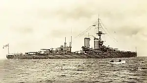 Between 17 and 20 July 1914, Centurion took part in a test mobilisation and fleet review as part of the British response to the July Crisis. Arriving in Portland on 25 July, she was ordered to proceed with the rest of the Home Fleet to Scapa Flow four days later[15] to safeguard the fleet from a possible surprise attack by the Imperial German Navy.[16] In August 1914, following the outbreak of the First World War, the Home Fleet was reorganised as the Grand Fleet, and placed under the command of Admiral Sir John Jellicoe.[17] Repeated reports of submarines in Scapa Flow led Jellicoe to conclude that the defences there were inadequate and he ordered that the Grand Fleet be dispersed to other bases until the defences be reinforced. On 16 October the 2nd BS was sent to Loch na Keal on the western coast of Scotland. The squadron departed for gunnery practice off the northern coast of Ireland on the morning of 27 October and her sister Audacious struck a mine, laid a few days earlier by the German auxiliary minelayer SS Berlin. Thinking that the ship had been torpedoed by a submarine, the other dreadnoughts were ordered away from the area, while smaller ships rendered assistance. On the evening of 22 November 1914, the Grand Fleet conducted a fruitless sweep in the southern half of the North Sea; Centurion stood with the main body in support of Vice-Admiral David Beatty's 1st Battlecruiser Squadron. The fleet was back in port in Scapa Flow by 27 November.[18]