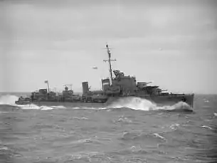 The ships mounted four 4.7-inch (120 mm) Mark IX guns in single mounts, designated 'A', 'B', 'X' and 'Y' from bow to stern. For anti-aircraft (AA) defence, they had two quadruple mounts for the 0.5 inch Vickers Mark III machine gun. The I class was fitted with two above-water quintuple torpedo tube mounts for 21-inch (533 mm) torpedoes.[3] One depth charge rack and two throwers were fitted; 16 depth charges were originally carried,[1] but this increased to 35 shortly after the war began.[4] Intrepid was one of the four I-class destroyers fitted with minelaying equipment in late 1938 – January 1939 at Malta. This consisted of mounts for rails on the deck on which to carry the mines and an electric winch to move the mines down the rails. A pair of sponsons were added to the stern to allow the mines to clear the propellers when dropped into the sea. 'A' and 'Y' guns and both sets of torpedo tubes were modified to allow them to be removed to compensate for the weight of the mines.[5] The ships could carry a maximum of 72 mines.[6] The I-class ships were fitted with the ASDIC sound detection system to locate submarines underwater.[7]