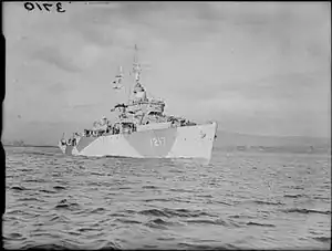 Rattler was laid down on 14 April 1941 at Harland and Wolff, Belfast, launched on 9 December 1942 and commissioned on 22 April 1943.[1][5] She was adopted by the community of Ripley, North Yorkshire after a Warship Week national savings campaign in March 1942.[6][7]