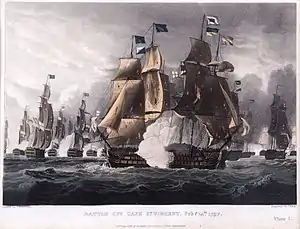 In 1797, Salvador del Mundo participated in the Battle of Cape St Vincent against the Royal Navy on 14 February under Brigadier Antonio Yepes. During the battle, Salvador del Mundo was dismasted and badly damaged before being captured by the British, with losses of 41 killed, including Yepes, and 124 wounded. William Prowse took command of the prize ship. Three other Spanish ships were captured during the battle.