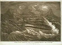 While under the command of Captain Valentine Edwards,[10][11] Sceptre was caught at anchor in a storm on 5 November 1799 along with seven other ships in Table Bay, near the Cape of Good Hope.[11] At 10:30am, the captain ordered the topmasts struck, and the fore and main yards lowered in order to ease the ship in the strengthening winds.[11] At midday, the ship fired a feu de joie on the occasion of the Gunpowder Plot, suggesting no apparent apprehension about the oncoming storm.[11] However within half an hour, the main anchor cable parted and despite the laying of a secondary one, this also broke.[11] At approximately 7pm, the ship was driven ashore onto a reef at Woodstock Beach at the site of the present-day Royal Cape Yacht Club and battered to pieces. One account states approximately 349 seamen and marines were killed or drowned. One officer, two midshipmen, 47 seamen, and one marine were saved from the wreck, but nine of these died on the beach.[12] The ship was wrecked a few hundred meters from the spot where a similar sized Danish warship, the Oldenborg was also wrecked in the same hurricane.[1]