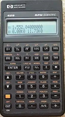 The HP-42S RPN Scientific is a programmable RPN Scientific hand held calculator introduced by Hewlett-Packard in 1988. It has advanced functions suitable for applications in mathematics, linear algebra, statistical analysis, computer science and others.