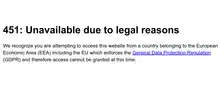 After introduction of the GDPR in the EEA it became common practice for websites located outside the EEA to serve HTTP 451 errors to EEA visitors instead of trying to comply with this new privacy law. For instance, many regional U.S. news sites no longer serve web browsers from the EU.[4][5][6]