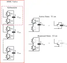 Like the two-level converter and the six-pulse line-commutated converter, a MMC consists of six valves, each connecting one AC terminal to one DC terminal. However, where each valve of the two-level converter is effectively a high-voltage controlled switch consisting of a large number of IGBTs connected in series, each valve of a MMC is a separate controllable voltage source in its own right. Each MMC valve consists of a number of independent converter submodules, each containing its own storage capacitor. In the most common form of the circuit, the half-bridge variant, each submodule contains two IGBTs connected in series across the capacitor, with the midpoint connection and one of the two capacitor terminals brought out as external connections.[35] Depending on which of the two IGBTs in each submodule is turned on, the capacitor is either bypassed or connected into the circuit. Each submodule therefore acts as an independent two-level converter generating a voltage of either 0 or Usm (where Usm is the submodule capacitor voltage). With a suitable number of submodules connected in series, the valve can synthesize a stepped voltage waveform that approximates very closely to a sine-wave and contains very low levels of harmonic distortion.