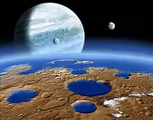 Habitability of extrasolar moons will depend on stellar and planetary illumination on moons as well as the effect of eclipses on their orbit-averaged surface illumination.[49] Beyond that, tidal heating might play a role for a moon's habitability. In 2012, scientists introduced a concept to define the habitable orbits of moons;[49] they define an inner border of an habitable moon around a certain planet and call it the circumplanetary "habitable edge". Moons closer to their planet than the habitable edge are uninhabitable. When effects of eclipses as well as constraints from a satellite's orbital stability are used to model the runaway greenhouse limit of hypothetical moons, it is estimated that — depending on a moon's orbital eccentricity — there is a minimum mass of roughly 0.20 solar masses for stars to host habitable moons within the stellar habitable zone.[17] The magnetic environment of exomoons, which is critically triggered by the intrinsic magnetic field of the host planet, has been identified as another factor of exomoon habitability.[31] Most notably, it was found that moons at distances between about 5 and 20 planetary radii from a giant planet could be habitable from an illumination and tidal heating point of view,[31] but still the planetary magnetosphere would critically influence their habitability.[31]