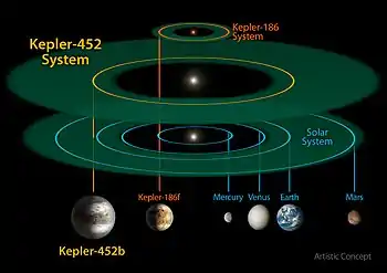 - ↑ Jenkins, Jon M.; Twicken, Joseph D.; Batalha, Natalie M.; Caldwell, Douglas A.; Cochran, William D.; Endl, Michael; Latham, David W.; Esquerdo, Gilbert A.; Seader, Shawn; Bieryla, Allyson; Petigura, Erik; Ciardi, David R.; Marcy, Geoffrey W.; Isaacson, Howard; Huber, Daniel; Rowe, Jason F.; Torres, Guillermo; Bryson, Stephen T.; Buchhave, Lars; Ramirez, Ivan; Wolfgang, Angie; Li, Jie; Campbell, Jennifer R.; Tenenbaum, Peter; Sanderfer, Dwight; Henze, Christopher E.; Catanzarite, Joseph H.; Gilliland, Ronald L.; Borucki, William J. (23 July 2015). "Discovery and Validation of Kepler-452b: A 1.6 R🜨 Super Earth Exoplanet in the Habitable Zone of a G2 Star". The Astronomical Journal. 150 (2): 56. arXiv:1507.06723. Bibcode:2015AJ....150...56J. doi:10.1088/0004-6256/150/2/56. ISSN 1538-3881. S2CID 26447864.