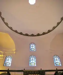 The exterior walls are built in courses of one cut stone and two bricks. The changing room of the men's section has four pointed-arch stained-glass windows above in the facade whiel the women's changing room has three windows.