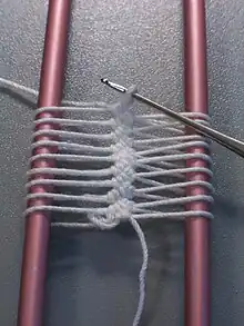 Hairpin lace is a lace-making technique that uses a crochet hook and two parallel metal rods held at the top and the bottom by removable bars. Historically, a metal U-shaped eponymous hairpin was used.