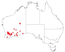 Hakea kippistiana is endemic to many scattered areas in the Wheatbelt and Goldfields-Esperance regions of Western Australia where it grows in red sandy soils around laterite.[3]
