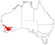 It is endemic to an area in the Wheatbelt and Goldfields-Esperance region of Western Australia from Dalwallinu to Coolgardie and south to Dumbleyung and Norseman where it is found on sandplains growing in sandy, loamy and gravelly soils often above or around laterite.[2]