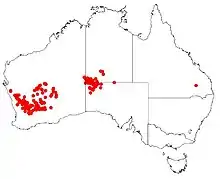 It occurs in Western Australia, the Northern Territory and South Australia.[6] In Western Australia it grows in semi-arid areas south through Mullewa to Merredin and Coolgardie. It is found in north western South Australia in the Central Ranges and the Great Victoria Desert[3] and in the south western parts of the Northern Territory extending north east to the MacDonnell Ranges.[8] Hakea minyma grows on sandy loam in mallee and mulga woodlands[4] also on spinifex dominated sandplains and dune swales and less commonly on rocky or gravelly ranges.[8]