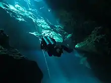 Haloclines are common in water-filled limestone caves near the ocean. Less dense fresh water from the land forms a layer over salt water from the ocean.[1] For underwater cave explorers, this can cause the optical illusion of air space in caverns. Passing through the halocline tends to stir up the layers.