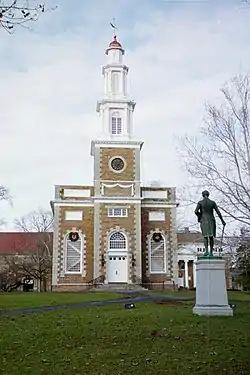 The façade was designed by architect Philip Hooker, notable for his many designs of public buildings in Albany, NY, as well as for designing Hyde Hall in Springfield Center, NY. The conservative Federal style of the chapel is characteristic of Hooker's work. The distinctive three story main body and interior design are credited to John H. Lothrop, a Hamilton College trustee. The design includes three bays on the eastern façade and eight bays of double hung windows along the north and south faces of the building. The mellow orange of the stone body of the chapel is Oriskany stone, while the corner quoins are of Trenton limestone. The Oriskany stone was quarried and laid by Reuben Wilcox of Whitestown, NY. The interior carpentry was done by Deacon Isaac Williams, of Clinton, NY. The tower of the eastern façade of the building is topped by a white, octagonal cupola. The quill weathervane[2] atop the cupola is representative of Hamilton College's commitment to teaching students to write effectively.[3][4]