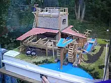 Water power became important with the introduction of blast furnaces and finery forges in the late medieval period. Blast furnaces needed to operate continuously for as long as possible and a series of ponds were often created in a valley to give a sustainable flow for the waterwheel. A campaign, as the production run was known, usually ran from October through to late spring when streams began to dry up, although Lamberhurst Furnace driven by the River Teise ran continuously for more than three years in the 1740s. Finery forges with three or four waterwheels to drive bellows and hammers needed more water than a furnace at times, although continuity was not as important. They tended to be sited downstream from a furnace if they were in the same valley. Ponds were created by building a dam known as a pond bay, which often served as a road, across one of the many valleys in the undulating Wealden landscape.[1] In 1754 one furnace was so drought-stricken that its manager considered hiring workmen to turn the wheel as a treadmill.[2] This need for continuous water power was an incentive in the development of the water-returning engine, a waterwheel driven by water raised by a steam engine pump.
