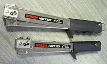 A Hammer stapler is a tool used for securing a variety of thin plastic and paper sheet building materials against flat surfaces by tacking a staple using a high velocity slapping motion similar to that of swinging a hammer. Typically the shallower the staple, the better hold its grip on the surface is.