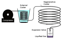 The Hampson–Linde cycle introduced regenerative cooling, a positive-feedback cooling system.[5] The heat exchanger arrangement permits an absolute temperature difference (e.g. 0.27 °C/atm J–T cooling for air) to go beyond a single stage of cooling and can reach the low temperatures required to liquefy "fixed" gases.