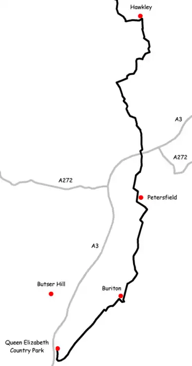 The footpath passes through Petersfield and Selborne along a series of steep-sided wooded hills, known as "The Hangers", and can be walked in either direction. The route can be used with the part of St Swithun's Way from Farnham to Alton to follow the geological edge of the chalk landscape between the North Downs and the South Downs.