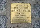 Following the 20 July failed attempt to assassinate Hitler, Josef Bürckel, Gauleiter of Gau Westmark where Germersheim was located, pressed Heinrich Himmler, who was the Reich's Security Official, to have Sponeck executed in retribution for the assassination plot, even though the latter had no contact with the German military resistance.[12] On Himmler's orders, Sponeck was shot to death on 23 July 1944.[13] Sponeck was buried in Germersheim and no citations or speeches were permitted at his grave. After the war, Sponeck's remains were transferred to the Soldiers' Cemetery at Dahn in the Palatinate Forest.