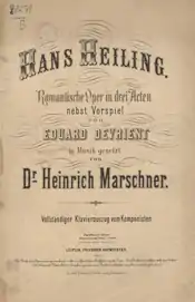 Hans Heiling is a German Romantic opera in 3 acts with prologue by Heinrich Marschner with a libretto by Eduard Devrient, who also sang the title role at the première at the Königliche Hofoper (now Berlin State Opera), Berlin, on 24 May 1833. From there, the work went on to become Marschner's most successful opera.[1] The opera brought the composer a considerable reputation, although this did not materially affect his position in Hanover, where he was music director of the Court Theatre.[2] Like Marschner's other great success, Der Vampyr, the plot of Hans Heiling makes great use of supernatural elements. As with several of his operas, Hans Heiling is based on a folk legend.[3]
