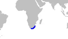 The brown shyshark has a restricted distribution along the coast of South Africa, from the Western and Eastern Cape Provinces to southern KwaZulu-Natal Province. It is usually found close to the bottom over sandy flats or rocky reefs, from the intertidal zone to a depth of 35 m (115 ft). However, it has been reported from as deep as 133 m (436 ft).[5][6] The range of this species overlaps with the puffadder shyshark in the southeastern Cape region. There, the brown shyshark tends to favor shallow inshore habitats, while the puffadder shyshark inhabits deeper offshore waters.[4]