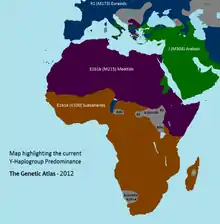 - ↑ Trombetta (2015). "Phylogeographic refinement and large scale genotyping of human Y chromosome haplogroup E provide new insights into the dispersal of early pastoralists in the African continent". Genome Biol Evol. 7 (7): 1940–50. doi:10.1093/gbe/evv118. PMC 4524485. PMID 26108492.