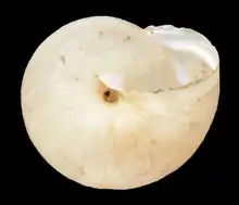 | Apertual view of a shell of Harmozica ravergiensis. Width of the shell is 12 mm. | |
