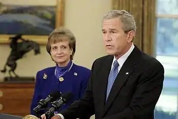Meanwhile, Senate Minority Leader Harry Reid (D-Nevada) recommended Miers as O'Connor's successor.[3][4][5] Bush agreed with Reid's suggestion, factoring comments by Senate Judiciary Committee Chairman Arlen Specter (R-Pennsylvania) and ranking member Patrick Leahy (D-Vermont) that Bush's nominees should be outside of the appellate court system.[6] First Lady Laura Bush and Senator Hillary Clinton had also both publicly expressed hope that he would nominate a woman.[7]