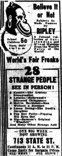- ↑ A.W. Stencell (2002). Seeing Is Believing: America's Sideshows. ECW Press. pp. 145–146. ISBN 1-55022-529-4.
