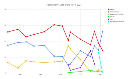 Labour won every contest for the seat since the first at the February 1974 election (and mostly won the predecessor constituency of The Hartlepools from the 1945 election onward) until Mortimer won the 2021 by-election, becoming the first Conservative MP to represent Hartlepool since 1959.