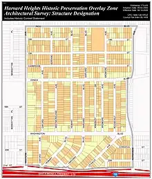 The Harvard Heights Historic Preservation Zone was adopted in 2000.[7] It encompasses 34 blocks comprised predominantly of single-family residences, some multiple-family residences, as well as commercial properties.[8][9] The designated historic zone lies between Pico Boulevard on the north, Santa Monica Freeway to the south, Normandie Avenue on the east and Western Avenue on the west. The HPOZ includes both the neighborhood of Harvard Heights to the north of Washington Boulevard and the neighborhood of West Adams Heights to the south.[8][9]