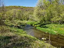 Hay Creek is a small trout stream in southeastern Minnesota. It has its headwaters west of Goodhue and empties into the Mississippi River just to the north of Red Wing.[2] It runs 25.1 miles (40.4 km).[3] Hay Creek was named for the hay meadows near its banks.[4] A railroad once ran along Hay Creek from the claybanks near Goodhue to the pottery and stoneware factories in Red Wing, which also made use of the water from the creek. The railroad was torn up in 1937, but traces such as trestle pilings remain.[5]