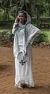 In Oriental Orthodox Christianity, Coptic women historically covered their head and face in public and in the presence of men.[176] During the 19th century, upper-class urban Christian and Muslim women in Egypt wore a garment which included a head cover and a burqa (muslin cloth that covered the lower nose and the mouth).[177] The name of this garment, harabah, derives from early Christian and Judaic religious vocabulary, which may indicate the origins of the garment itself.[177] Unmarried women generally wore white veils while married women wore black.[176] The practice began to decline by the early 20th century.[176]