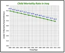 In the 1960s, Iraq was "one of the best countries in which to be a child" according to the UNICEF statistics. At the same time in 1981, Iraq had the 2nd lowest Infant Mortality Rate worldwide. In the late 1990s, Iraq's under-five mortality rates have dropped by approximately 50% - from 44.8 deaths per 1000 live births in 2000 to 34.4 in 2012.[11][12]