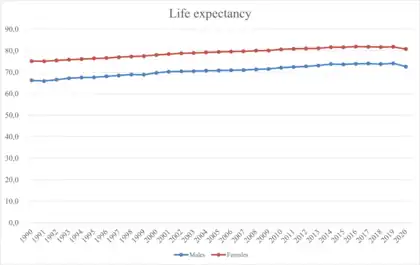 Life expectancy in Poland at birth was 74.1 years for men in 2019 and 81.8 for women.[1] In 2019 life expectancy for both sexes reached value 77.86 years.[2] Despite that, the life expectancy in Poland was rapidly increasing in the last 30 years, it is still three years below the European Union average, ranking Poland number 29 on the EU life expectancy list by country in 2016. Cardiovascular diseases and lung cancer are the most notable cases of mortality.