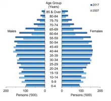 The Age dependency ratio in Singapore was reported at 37.98% in 2016, according to the World Bank collection of development indicators, and is expected to reach 36.3% by 2030 and 60.6% by 2050.[12] The retired population will therefore make up a growing share of the population in the upcoming years. Factors contributing to this growth include rising life expectancy and falling birth rates.[13]
