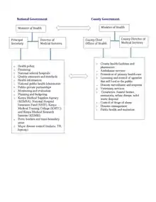 In the devolved government, the Kenya Health Policy 2014 – 2030 provides guidance to the health sector in terms of identifying and outlining the requisite activities in achieving the government's health goals.[19] The policy is aligned to Constitution of Kenya and global health commitments.