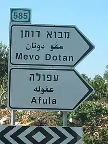 The Hebraization of place-names was encouraged by the Israeli government, aiming to strengthen the connection of Jews, most of whom had immigrated in recent decades, with the land.[12] As part of this process, many ancient Biblical or Talmudic place-names were restored.[13] In other cases, sites with only Arabic names and no pre-existing ancient Hebrew names or associations have been given new Hebrew names.[14][13] In some instances, the Palestinian Arabic place name was preserved in the modern Hebrew, despite there being a different Hebrew tradition regarding the name, as in the case of Banias, which in classical Hebrew writings is called Paneas.[15] Municipal direction sign-posts and maps produced by state-run agencies sometimes note the traditional Hebrew name and the traditional Arabic name alongside each other, such as "Nablus / Shechem" and "Silwan / Shiloach" etc.[16] In certain areas of Israel, particularly mixed Jewish–Palestinian cities, there is a growing trend to restore the original Arabic street names that were Hebraized after 1948.[17][18]