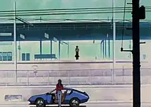 During the episode, existing geographical places such as Atsugi, Gōra,[10] the Ōwakudani valley,[26] and Lake Ashi, are named and drawn.[27][28] A fictional JRG train model named Odakyu 7700 series CHiSE was also drawn for the episode.[29] Hayashibara and Hiro Yūki served as female and male speakers of the train, respectively. Hayashibara and Yūko Miyamura also voiced two prostitutes in a scene in which Shinji wanders Tokyo-3 at night.[3] For the last scene, which is set in the New Hakone Yumoto station, staff took inspiration from the real Hakone-Yumoto Station.[26][30] The stairs into which Shinji is led by the men in black were depicted as dark, similar to the corridors of a prison.[31] Another Okadyu Romancecar train similar to the Odakyu 10000 series HiSE[26] was drawn for the scene,[27][32] along with a Renault Alpine A310 car without modifications driven by Misato.[27][33] In the same sequence, the songs Bay Side Love Story – from Tokyo and Face from Masami Okui's album Gyuu (1995) were used as background music.[34] A fifty-second-long take in which Shinji and Misato look at each other in the station was added as a conclusion to the episode.[35][36] The take was originally supposed to be one minute long, but staff decided to cut it during production.[2] British singer Claire Littley also sang a cover of "Fly Me to the Moon" which was later used as the episode's closing theme song,[37] replaced in late home video editions by another cover by Yoko Takahashi.[38]