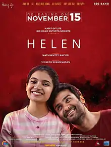 Helen is a 2019 Indian Malayalam-language survival thriller film directed by Mathukutty Xavier (in his directorial debut) and produced by Vineeth Sreenivasan under the companies Habit of Life and Big Bang Entertainments.[2][3] The film stars Anna Ben in the title role, while Lal, Noble Babu Thomas, Aju Varghese, Rony David and Binu Pappu appears in supporting roles. It was written by Alfred Kurian Joseph, Noble Babu Thomas and Mathukutty Xavier. Its soundtrack was composed by Shaan Rahman.[4]