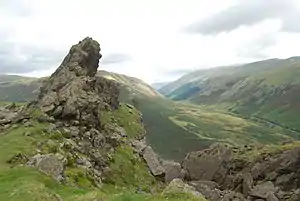 At either end of the highest ridge are the rock outcrops that ensure Helm Crag's fame. Only one can be seen from any point in the surrounding valleys, and they have a variety of names depending upon the profile seen from the particular vantage point. The northwestern outcrop is the true summit of the fell, a tricky little scramble being needed to stand on the top. It is variously called "The old lady playing the organ" when seen from Mill Gill, "The howitzer" from the summit of Dunmail Raise and "The lion and the lamb" or "The lion couchant" from a point in between. The southern outcrop is prominent from Grasmere and this is the traditional "Lion and the lamb".[3]