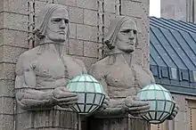 The railway tracks in Helsinki were built in the 1860s. The station building, clad in granite, was designed by Eliel Saarinen and inaugurated in 1919. The building is known for its clock tower and the Lyhdynkantajat ("The Lantern Bearers") statues by Emil Wikström.[3] Helsinki Central was chosen as one of the world's most beautiful railway stations by BBC in 2013.[4] The Helsinki Central Station has become the symbol of the entire railway network in Finland. For example the VR Group uses the image of the station and the statues next to its main entrance in its advertising.[5]:356