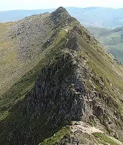Striding Edge begins at Hole-in-the-Wall and then stretches for over 1.5 km (1 mi) to the Helvellyn summit plateau. This starting point is accessible from both Glenridding and Patterdale. Hole-in-the-Wall used to be a prominent gap in the stone wall on the top of the ridge where a gate was missing.[11] Today the gap has been filled in and a ladder stile crosses the wall. From here the initial part of the ridge is relatively rounded and has a solid path running along the right-hand side. This changes upon reaching High Spying How, the highest point on the ridge — 863 m (2,831 ft). At this point a narrow path continues close to the top of the ridge, which becomes increasingly narrow, and scramblers will often follow the very top of the arête.