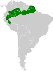It is found in the northern Amazon Basin of Brazil and the Guianas of French Guiana, Suriname, and southeast Guyana; also Amazonian Colombia, Venezuela, Ecuador and Peru.