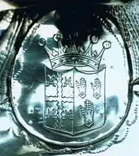 {{citation}}: CS1 maint: location missing publisher (link) - "Bourchier, Rachel, Countess of Bath (1613 - 1680) (Stamp 1)", British Armorial Bindings, University of Toronto Libraries — "cross engrailed betweengauntlets (3)water bougets (4)"