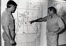 In the 1960s, however the navy was paying scant attention to anti-surface tactics, naval gunfire support, and gunnery in general. In July 1964, halfway through his tour, Mustin made lieutenant commander a year early. Remembering Shoup's point that the surface Navy could not support an amphibious invasion of Cuba, he thought the Conyngham ought to spend a lot of time on gunfire support. The computers in the Conyngham, one of the last of the Adams-class, Mustin knew, were digital and worked on Cartesian coordinates. The procedure "was borderline unworkable," he said. "The fire support doctrine had guys cranking north-south-east-west dials trying to get a vector at 45 degrees, so I invented a whole new procedure in which you used north-south-east-west coordinates instead of polar coordinates."[1] To avoid the hand cranking, he had his department use a Cartesian plotting board that cut time by 70 percent and increased accuracy. Wholly counter to the commander's existing doctrine, his solution, despite record scores, earned the ship penalties during the force competitions at Guantanamo for not following procedure. He persisted and eventually got approval for his new gunfire support procedure, which was used throughout the destroyer force and later employed extensively for naval gunfire support in Vietnam. For this work, he got a Navy Achievement Medal, at the time rarely awarded.