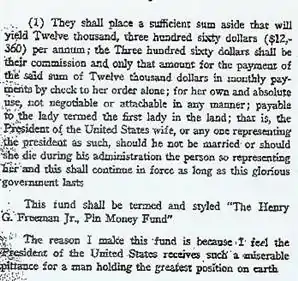 Freeman believed that the president of the United States was paid a "miserable pittance", and that a way of increasing his income while avoiding the appearance of political gifts was to institute an annuity of $12,000 per year ($274,000 in today's dollars[1]) to be paid "to the lady termed the first lady in the land; that is, the President of the United States [sic] wife, or anyone representing the president as such, should he not be married or should she die during his administration." Freeman's will specified that the money be for the first lady's "own and absolute use" and the payments "shall continue in force as long as this glorious government exists."